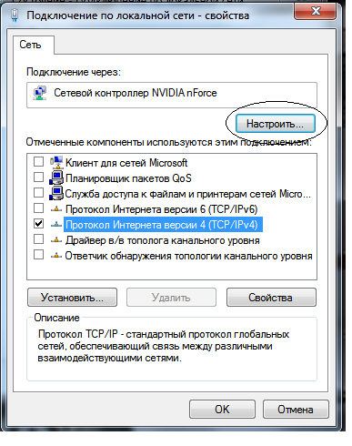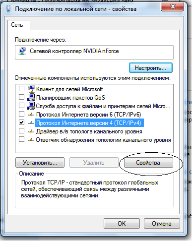 Шаг 4 : Убираем все галочки кроме "Протокол Интернета версии 4(TCP/IPv4)" , выбираем Протокол Интернета версии 4(TCP/IPv4) и нажимаем кнопку свойства