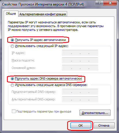 Шаг 5:В свойствах TCP/IP протокола нужно выбрать автоматическое получение IP-адреса и DNS сервера. "OK":