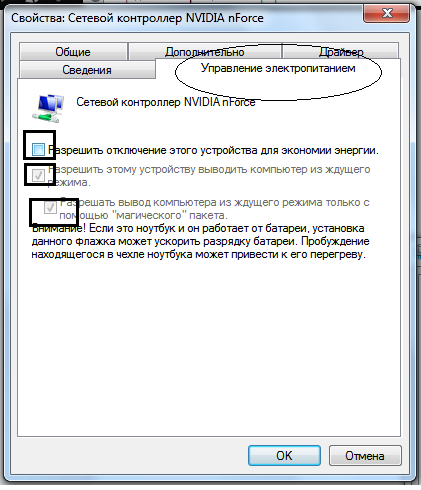 Шаг 6: В этом окне переходим на вкладку "Управление электропитанием " и убираем все голочки которые там есть: